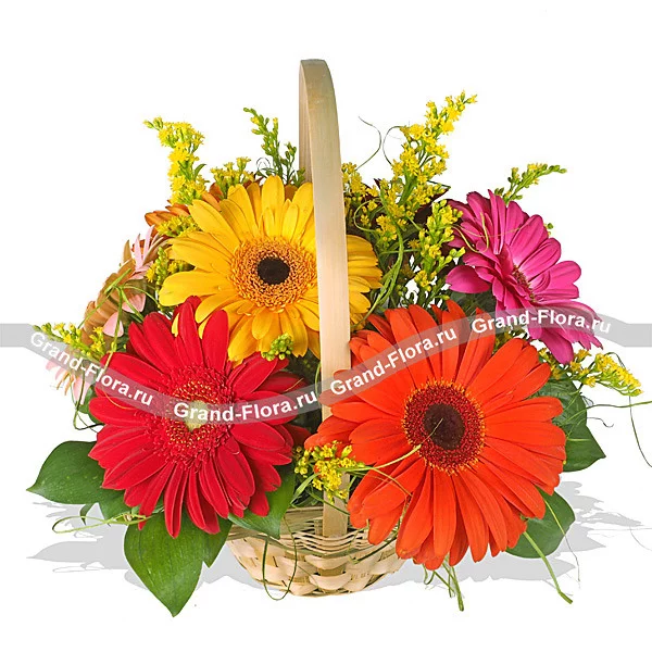 Стандартный (на фото): герберы разноцветные - 7 шт., солидаго - 2 шт., рускус, оазис, корзина малая.