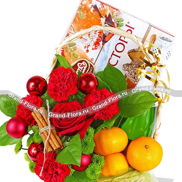 ЛЮКС: гвоздика - 5шт., роза красная - 1шт., хризантема зеленая (сантини) - 2шт., корица, мандарины - 1,5кг., конфеты "Родные просторы" (278 г.) - 1шт., еловая ветвь - 2 шт., новогодний декор и зелень, желтый фетр, оазис, корзина средняя.
