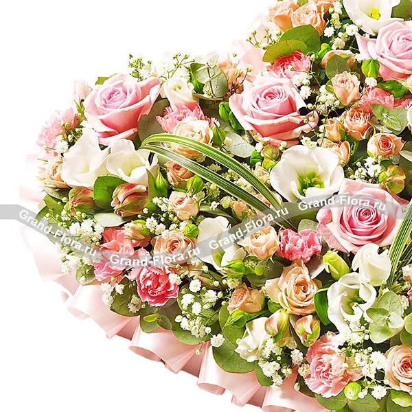 Мечта Богини - сердце из оазиса с розовой розой, эустомой и альстромерией