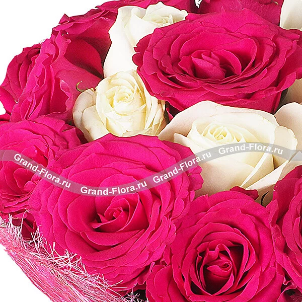 ДЕЛЮКС: роза розовая - 14 шт., роза белая - 11 шт., сизаль розовый, бант розовый. Примерный размер: 45Х45 см.