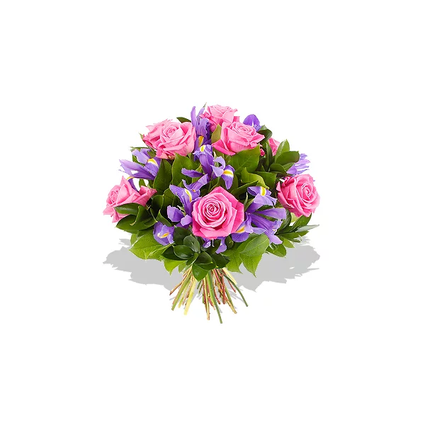 Стандартный: роза розовая - 7 шт., ирис - 8 шт., лента розовая.