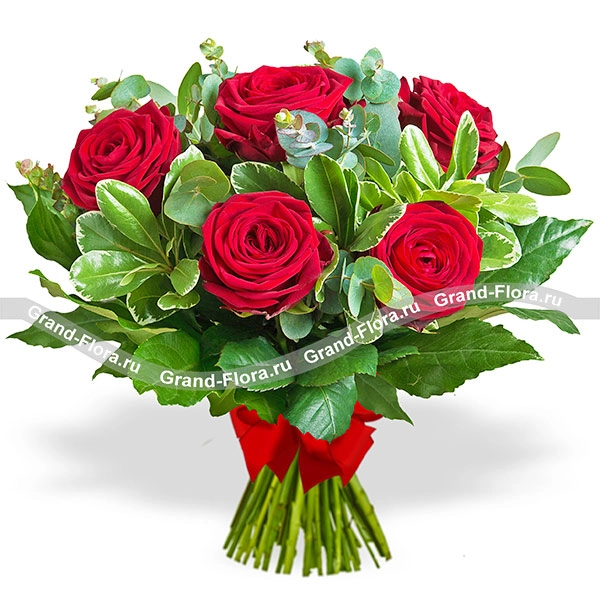 5 роз: роза красная - 5 шт., рускус - 3 шт., эвкалипт - 2 шт., упаковка, бант красный.