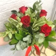 Букет из красных роз, гармонично дополненный рускусом и эвкалиптом, станет отличным поздравлением как для женщин, так и для мужчин.