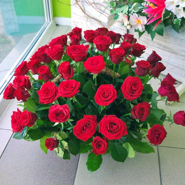 Я заказывала эту корзину красных роз с доставкой на дом. привезли вовремя, очень удобно что оплатила все картой на сайте заранее, и все привезли к точному времени! Супер!