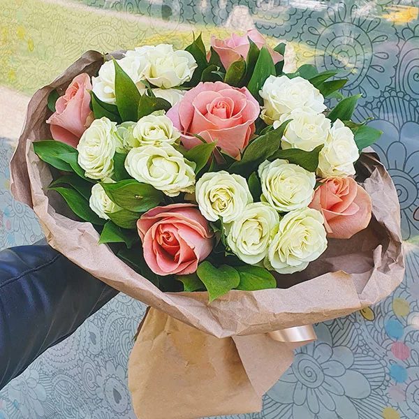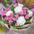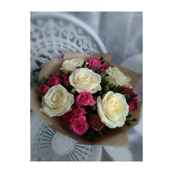ЛЮКС: роза белая - 15 шт., роза кустовая розово-белая - 8 шт., декоративная зелень, упаковка крафт, лента кремовая. Примерный размер: 35Х35 см.