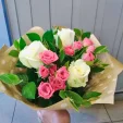 Уменьшенный: роза белая - 3 шт., роза кустовая розово-белая (возможна замена на розовую/малиновую) - 2 шт., декоративная зелень, упаковка крафт, лента кремовая. Примерный размер: 20Х20 см.