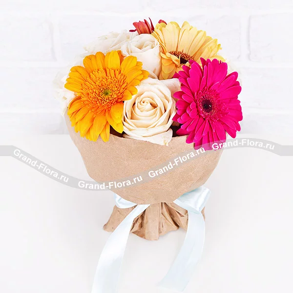Стандартный: гербера микс - 8 шт., роза белая - 9 шт., упаковка, лента.Примерный размер: 25Х25 см.
