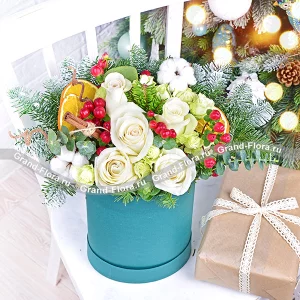 Стандартный: роза красная - 7 шт., хлопок - 3 шт., шарики - 2 шт., декоративная зелень, ель, декор, оазис, коробка.