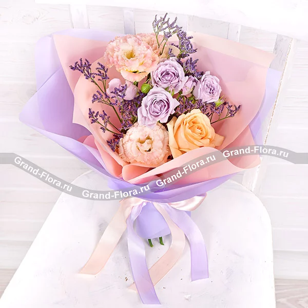 Чарующие и необыкновенные розы сиреневого и кремового оттенка, розовая эустома и фиолетовый лимониум в букете выглядят гармонично, роскошно и привлекательно.